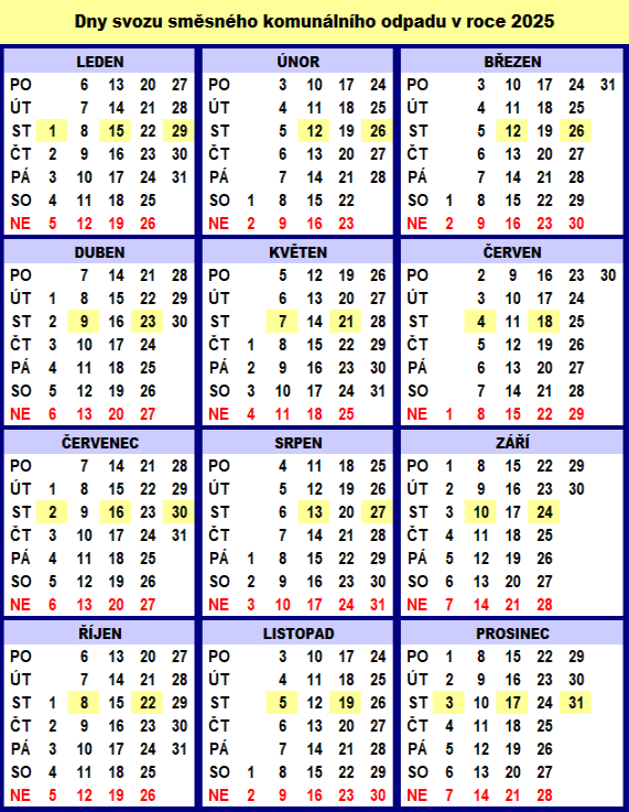 Svoz směsného komunálního odpadu probíhá v roce 2025 vždy po 14 dnech, každou lichou středu, viz kalendářní přehled.