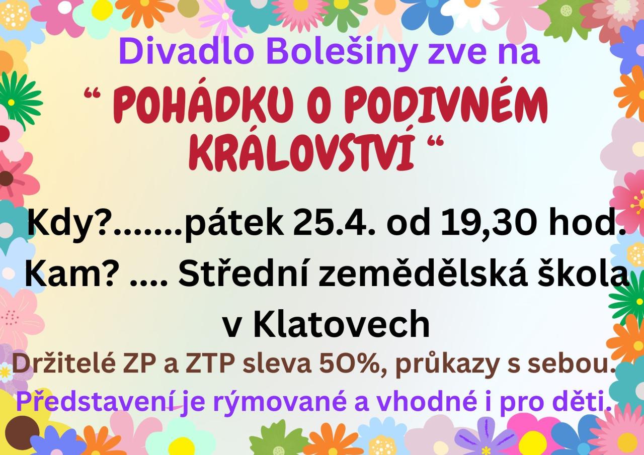 Divadlo Bolešiny zve všechny malé i velké na rýmovanou pohádku "Pohádka o podivném království". Akce se uskuteční v pátek 25. dubna 2025 od 19:30 hodin na Střední zemědělské škole v Klatovech. Držitelé ZP a ZTP mají nárok na 50% slevu, přineste si prosím průkazy.