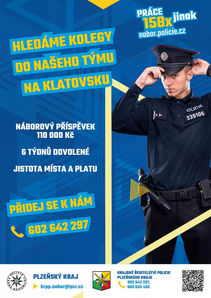Krajské ředitelství Policie Plzeňského kraje hledá nové kolegy do policejního týmu na Klatovsku. Některé informace a kontakty jsou uvedeny na přiloženém náborovém letáku.